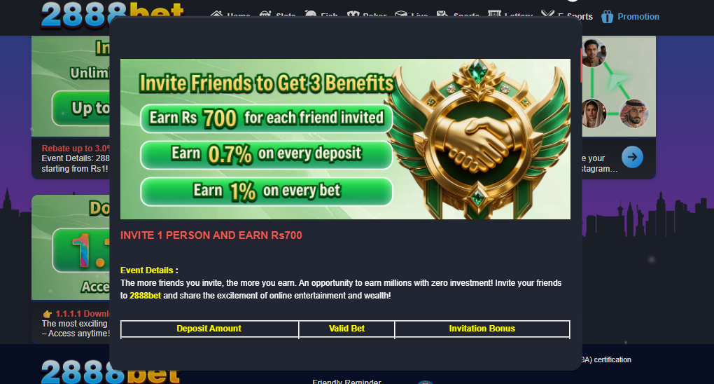 2888 bet App is an real earning apk by which you can earn money by investing and also earn without investing by their best Feature known as referral to earn program you just have to share the referral link provided in the platform account share with your family members, friends or on any social sharing platform.
